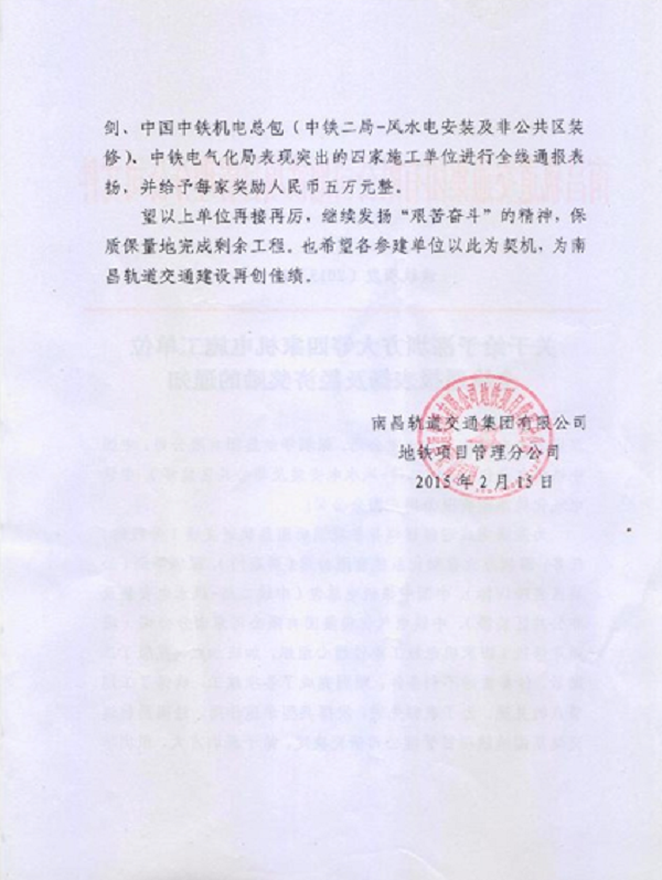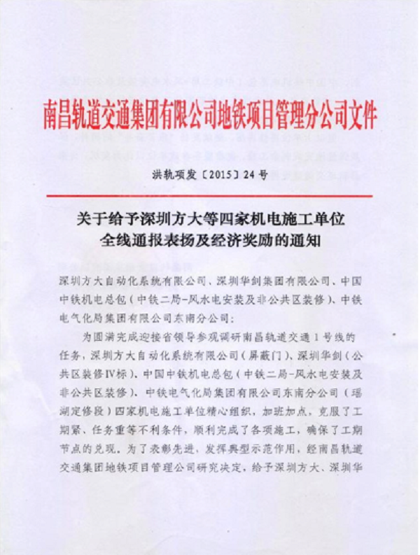新年伊始,FUN乐天使自动化公司再次喜获嘉奖。南昌轨道交通集团为表扬先进,决定给予深圳市FUN乐天使自动化系统有限公司等四家施工单位通报表扬。并给予五万元奖励。
