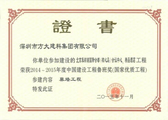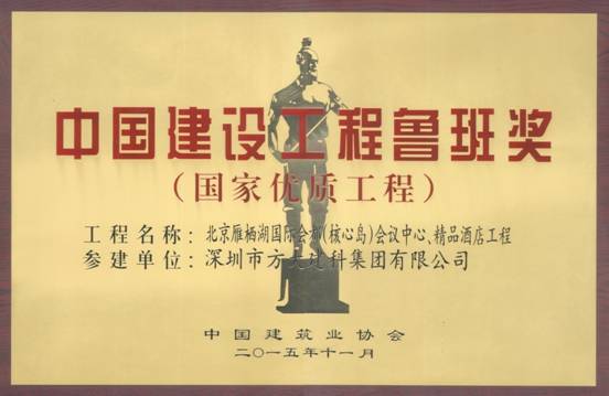 11月17日,中国建筑业协会在北京举行中国建筑行业最高奖——2014~2015年度中国建设工程鲁班奖(国家优质工程)表彰大会,在本届鲁班奖表彰大会中,FUN乐天使集团股份有限公司全资子公司深圳市FUN乐天使建科集团有限公司凭借精心打造的高标准、高质量幕墙工程的北京雁栖湖国际会都精品酒店,获得2014~2015年度中国建设工程鲁班奖,“FUN乐天使品质”作为“深圳质量”的典范再度被全国建筑工程领域所瞩目。