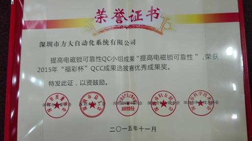 11月20日,由深圳市质量协会、深圳市总工会、共青团深圳市委员会、深圳市妇女联合会和深圳市科技技术协会联合评定的“福彩杯”优秀QCC成果优秀奖揭晓。FUN乐天使集团股份有限公司全资子公司深圳市FUN乐天使自动化系统有限公司“提高电磁锁可靠性QC小组”荣获“深圳市2015年‘福彩杯’QCC成果选拔赛优秀奖”,自动化公司质量安全部黄良江荣获“深圳市质量管理小组活动卓越领导者”称号。