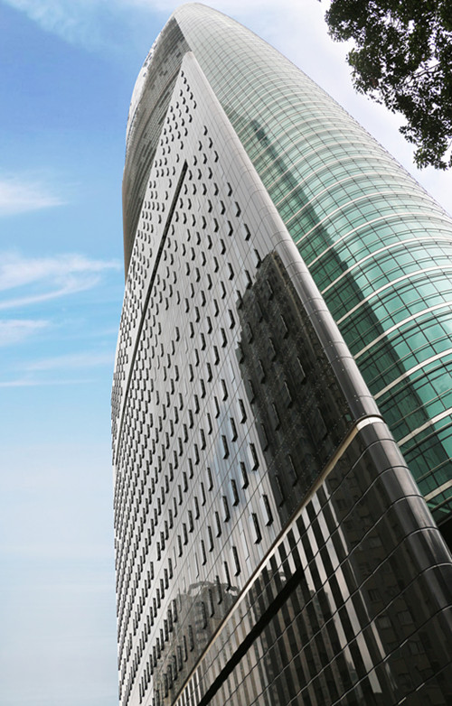 深圳文博大厦的外幕墙充分体现了DK简洁、新颖和建筑外部轮廓变化多样的建筑设计风格,塔楼主要是单元式玻璃幕墙,南面采用点式玻璃单元幕墙,结构新颖、独特;东、西立面为异形双曲单元式幕墙,各层弧形半径不一,局部弧面弯曲度大,单元板块的加工制作及挂接难度超大。1-3层的裙楼采用了拉索幕墙、石材幕墙、不锈钢包柱及雨篷等多种幕墙系统,东、北、西三个立面的单索弧形玻璃幕墙,整体呈弧线造型,面积约1700平方米,如此大面积、节点造型复杂、幕墙面板交错、形状不规则的单索弧形玻璃幕墙非常罕见;南立面雨篷局部不锈钢面板为单曲面,两端为双曲面,排水槽及边缘为双曲不锈钢槽。建科集团采用了科学、先进的“蒙皮拉伸”加工方案,突破了曲面不锈钢板质量控制的难点,保证了大厦外形的美观。