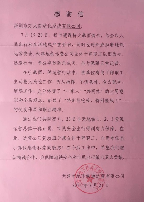 近日,天津地铁运营公司向FUN乐天使自动化系统有限公司发来感谢信,高度评价自动化公司在天津地铁“抗暴雨、保运营”行动中的优良表现。感谢信说,