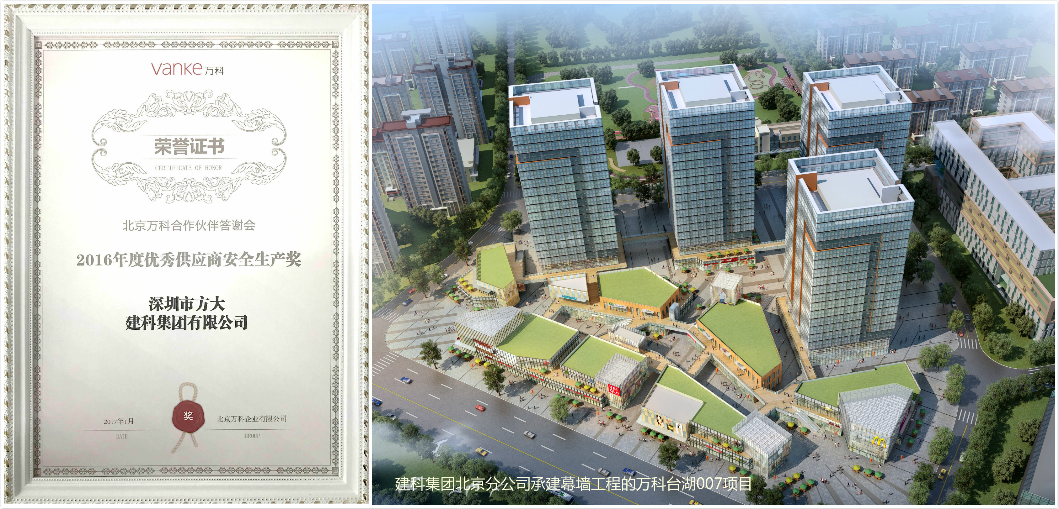 北京台湖万科007项目是万科旗下的精品地产项目,其幕墙工程由建科集团北京分公司承建。在项目团队的周密筹划和艰苦努力下,万科台湖007项目幕墙工程的现场管理工作成绩斐然,安全文明生产及现场项目管理能力受到业主的好评。此次建科集团北京分公司被.业主授予“2016年度优秀供应商安全生产奖”,表明2016年建科集团北京分公司的安全文明生产及现场管理能力又有了较大的提升。