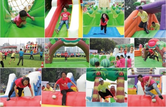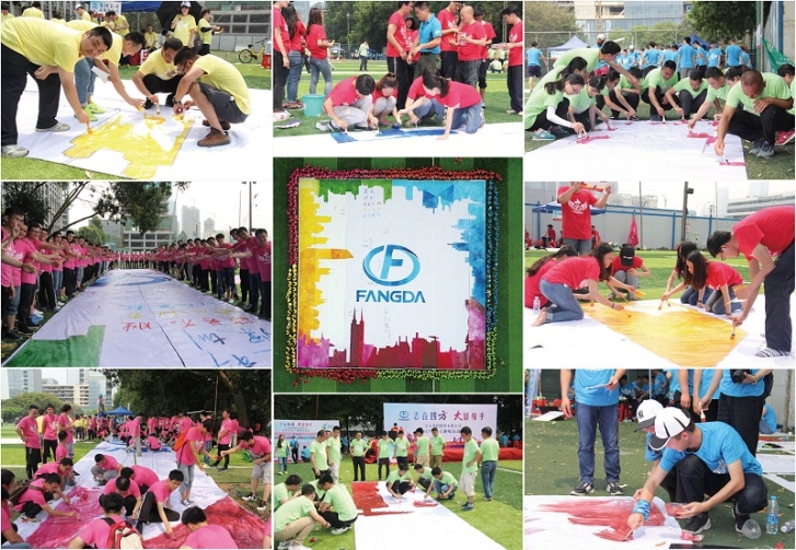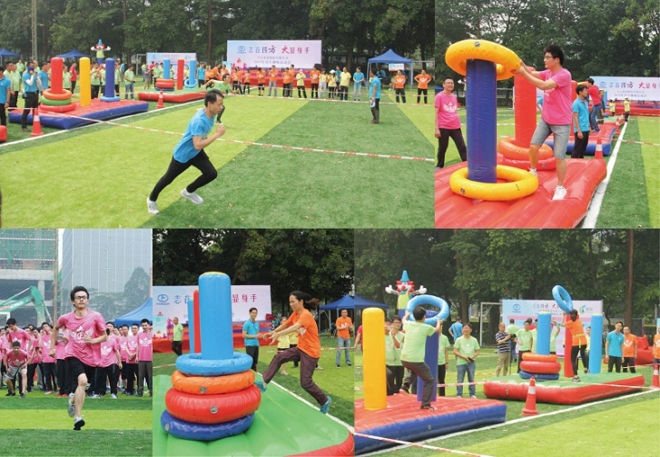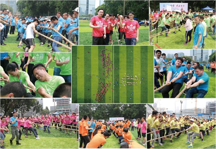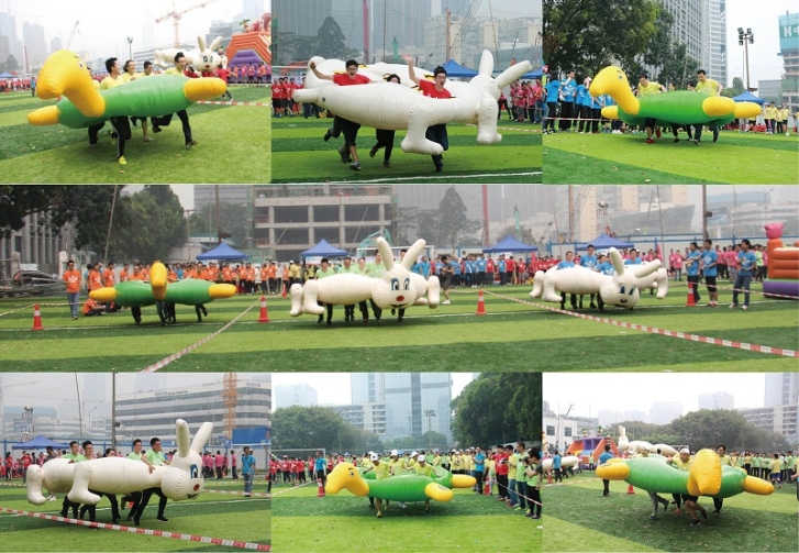 本次运动会设置了龟兔赛跑、超级汉诺塔、快乐gogogo、趣味拔河、纳斯卡巨画等趣味项目,比赛场上处处充满着欢声笑语,大家玩得不亦乐乎!在龟兔赛跑环节,各代表队的队员们分别顶着巨型充气“乌龟”、“兔子”笑着跑着,奋力竞争,争取最好的比赛成绩;在超级汉诺塔环节,考验的不仅有团队成员的运动能力,还有团队内部的组织协作效率;在快乐gogogo环节,更是掀起了所有参赛员工的火热激情,他们在气垫城堡中穿梭、攀爬、滑行、滚动,在回味和体验孩童时代乐趣的同时,为自己的团队争取好的名次;趣味拔河环节是这次运动会的最高潮,只见加油的叫喊声震天动地,拔河的队员无不神态激越,使出浑身之力,将拔河绳拉得吱吱地响;最后是纳斯卡巨画环节,参与运动会的全体员工一同用五颜六色的油彩,分工合作,共同绘出印有FUN乐天使集团logo的巨型图画。通过百米高空上无人机的航拍我们看到,在530余名FUN乐天使人簇拥中的FUN乐天使logo巨画,在灿烂阳光的照耀下,正闪闪发光,正如她在行业中的响亮知名度一样。
