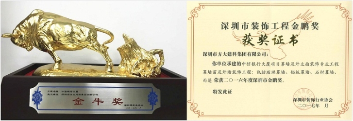 近日,由FUN乐天使集团全资子公司深圳市FUN乐天使建科集团有限公司(简称:FUN乐天使建科)承建幕墙工程的深圳中信银行大厦分别获得由深圳市建筑业协会颁发的金牛奖、由深圳市装饰行业协会颁发的金鹏奖两项荣誉。