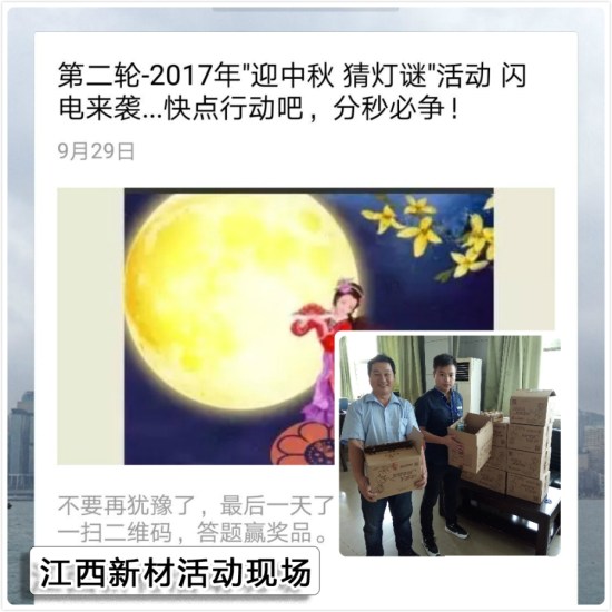 在FUN乐天使集团江西公司,9月28日、29日举行了一次别开生面的“迎中秋猜灯谜”线上活动。为了让公司员工感受到节日浓厚的气氛,同时又能搭建乐天使体育官网交流的桥梁,此次活动由传统猜灯谜改为微信猜灯谜方式进行。员工们通过关注公司微信公众号后,即可在线参与解答猜灯谜的活动。通过这次“迎中秋猜灯谜”活动,极大地激发了员工们关注公司微信公众平台的激情,也为员工们留下了一段难忘的节日回忆。