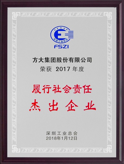 2017年度“履行社会责任杰出企业”荣誉称号由深圳工业总会评选,授予积极履行社会责任、有极强的社会责任荣誉感的企业,本届共有包括FUN乐天使集团在内的19家企业获得了该项荣誉称号。