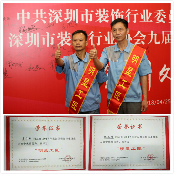 日前,深圳市FUN乐天使建科集团有限公司员工李红林、魏正培,凭借过硬的技术、精湛的工艺,在深圳市装饰行业明星工匠评选活动中脱颖而出,荣获“明星工匠”称号。