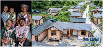 这是一张拼版照片。左图:怒江傈僳族自治州贡山县独龙江乡迪政当村独龙族的“文面女”李文仕(前排左)一家合影(6月21日摄);右图:李文仕和其他村民的房子(6月21日摄),这些房子是当地政府在2011年统一修建的。新华社记者 江文耀 摄
