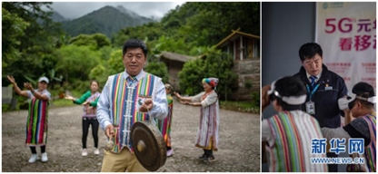 这是一张拼版照片。左图:在怒江傈僳族自治州贡山县独龙江乡移动营业厅上班的马春海(独龙族)。在他身后,独龙族群众在跳本民族舞蹈(6月21日摄);右图:马春海在指导当地群众体验5G虚拟现实设备。独龙江乡今年开通了5G试验基站(6月21日摄)。新华社记者 江文耀