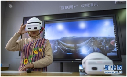 独龙族姑娘熊玉兰在怒江傈僳族自治州贡山县独龙江乡体验VR眼镜(4月19日摄)。新华社记者 江文耀 摄