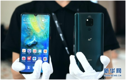 工作人员展示华为公司发布的首款5G商用手机——华为Mate 20 X 5G(7月26日摄)。新华社记者 毛思倩 摄