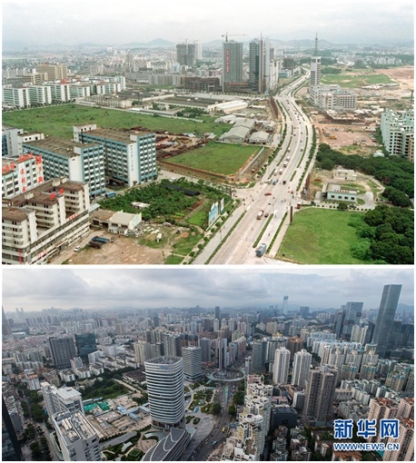 拼版照片:上图为位于深圳南头半岛上的南油开发区(资料照片,新华社记者张肄文摄);下图为2018年6月20日拍摄的原南油开发区(新华社记者毛思倩摄)。新华社发