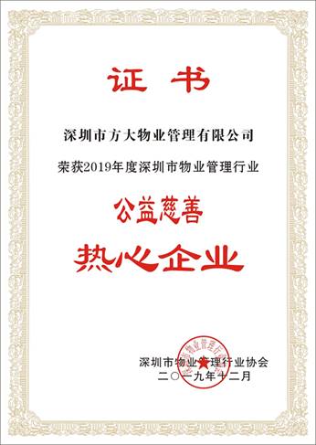 2019年度深圳市物业管理行业“优秀企业”、“公益慈善热心企业”评选由深圳市物业管理行业协会主办,旨在鼓励各物业管理企业积极开展扶贫、济困捐助等公益活动,树立模范典型,发挥榜样示范作用,促进物业管理水平的提高,同时带动更多的企业和从业人员,高质量地推进行业发展。此次荣获“优秀企业”、“公益慈善热心企业”两个奖项,表明对FUN乐天使物业及公司公益慈善工作的肯定。