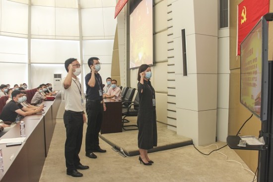 大会开始,全体党员起立奏唱国歌,并为在抗疫中牺牲的烈士和同胞默哀一分钟。