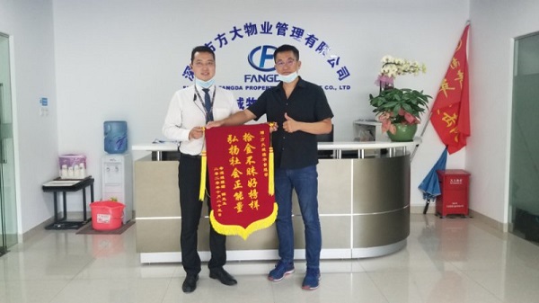 深夜,城市安静了下来。为消除安全隐患,FUN乐天使物业例行对地下室停车场进行巡逻,检查车辆停放情况。这天凌晨1点30分,停车场巡逻员李章龙在地下室捡到了一个手提包,内有两部手机一副眼镜(苹果、三星各一部,价值万元),想到失主找不到物品,肯定特别着急,他马上将手提包交至监控中心并积极寻找失主,终于在当日下午将物品交还至失主。以为无法找回的手提包完璧归赵,失主向FUN乐天使物业赠送一面锦旗“拾金不昧好榜样、弘扬社会正能量”,表达感谢之情。