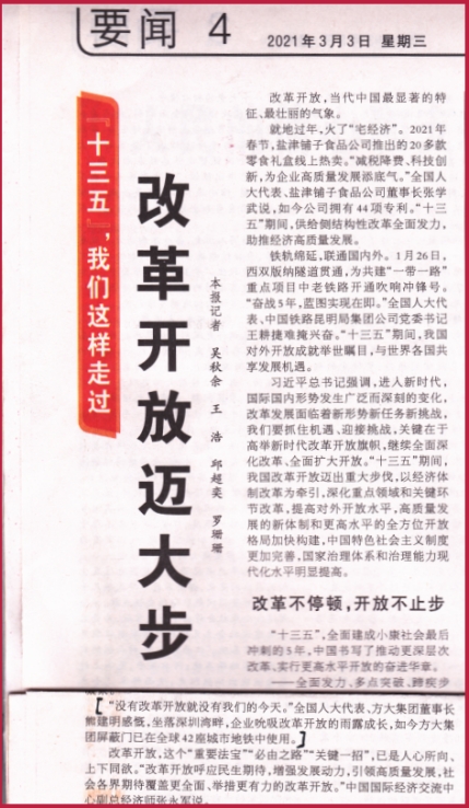 就地过年,火了“宅经济”。2021年春节,盐津铺子食品公司推出的20多款零食礼盒线上热卖。“减税降费、科技创新,为企业高质量发展添底气。”全国人大代表、盐津铺子食品公司董事长张学武说,如今公司拥有44项专利。“十三五”期间,供给侧结构性改革全面发力,助推经济高质量发展。