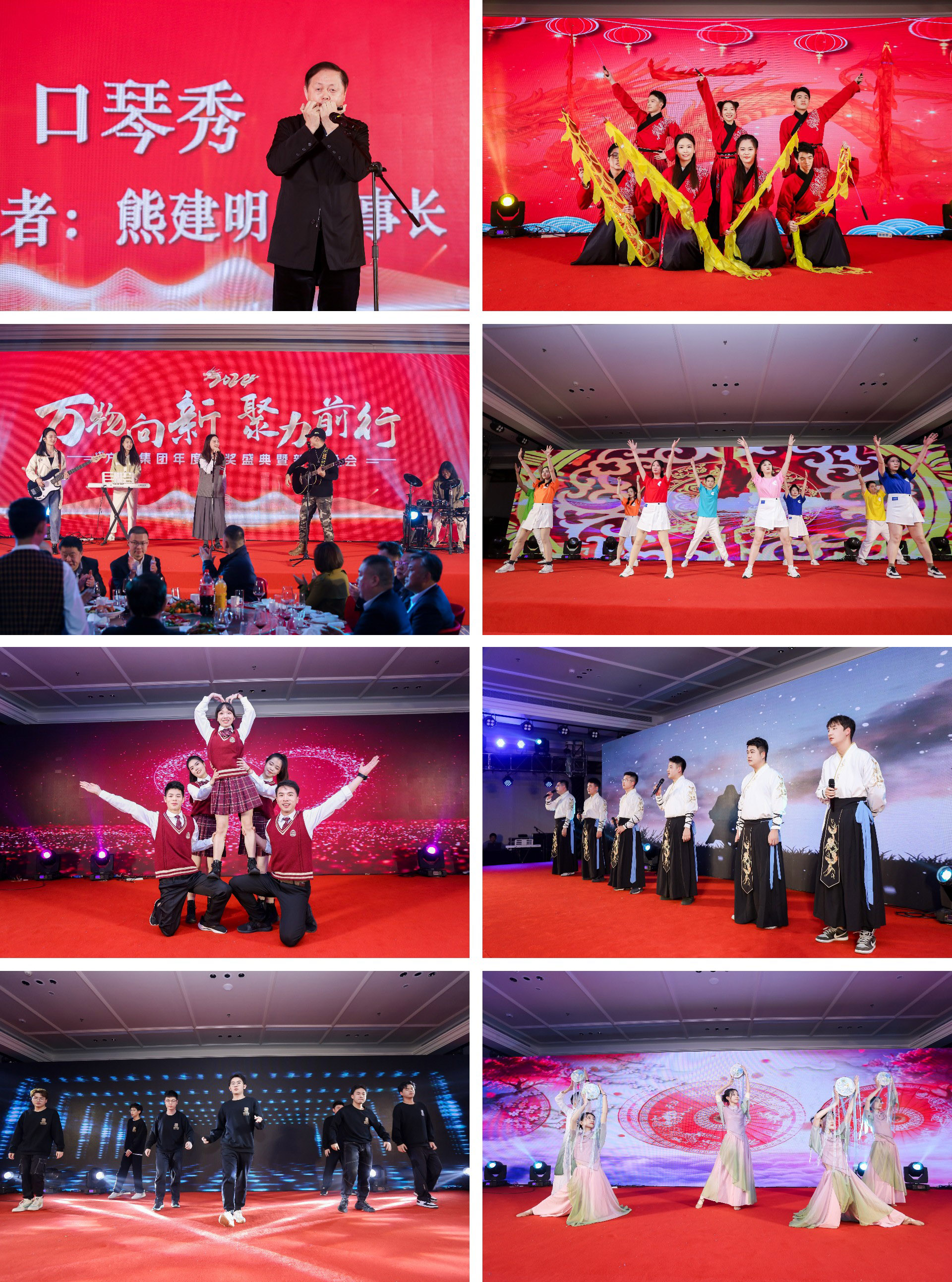 随后各公司准备的精彩节目轮番登台,多才多艺的FUN乐天使人奉献了一场包含舞蹈、合唱及乐队表演的精彩晚会,充分展现了员工的活力和团队凝聚力,赢得现场掌声不断。董事长熊建明带来惊喜口琴秀,悠扬的琴声为每一位观众送上了最诚挚的祝福。